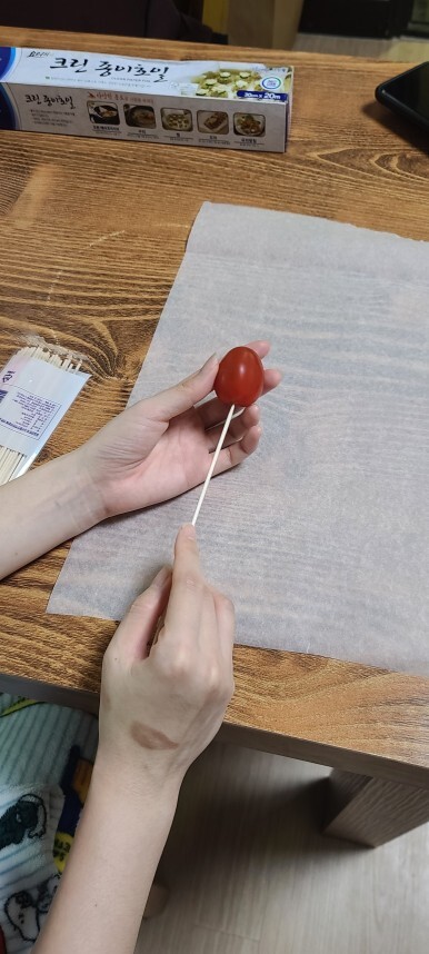방울토마토를 꼬지에 꽂아서