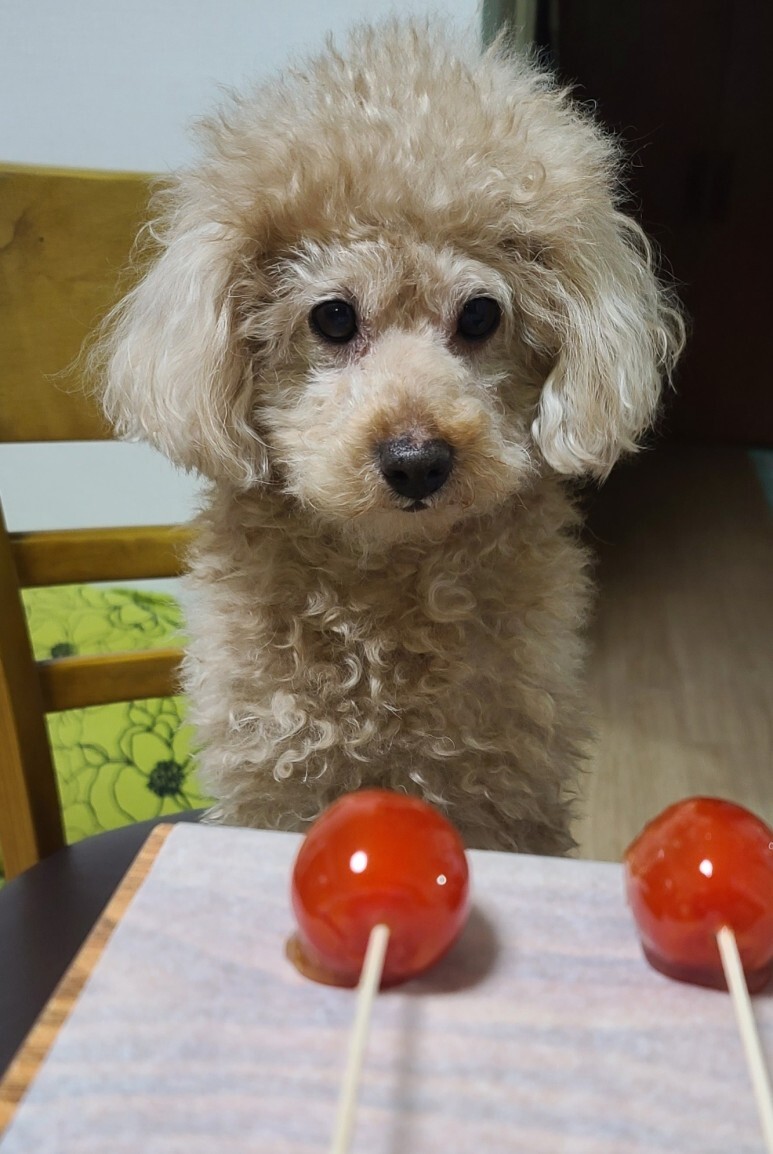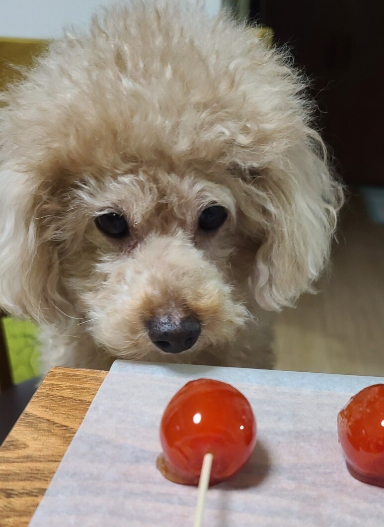 방울토마토탕후루 냄새가 좋은지 먹어보고